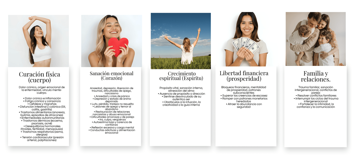 Esto depende de tus objetivos y de la profundidad de tus bloqueos. Algunos clientes acuden a unas pocas sesiones para trabajar un problema específico, mientras que otros se comprometen a un proceso más largo para lograr una transformación profunda en múltiples áreas de su vida.